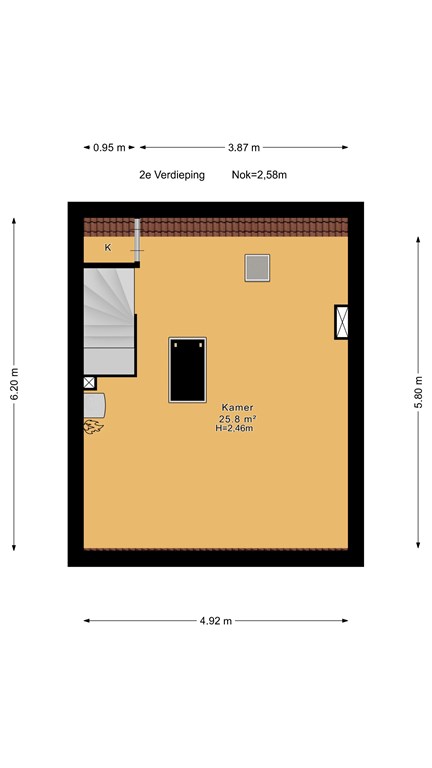Tweede verdieping: royale zolderverdieping van ca. 29 m², momenteel één open ruimte met veel mogelijkheden om extra kamers te realiseren. Op de zolderverdieping is de HR CV ketel (2022) te vinden. Daarnaast beschikt de zolder over knieschotten en een handige vliering.